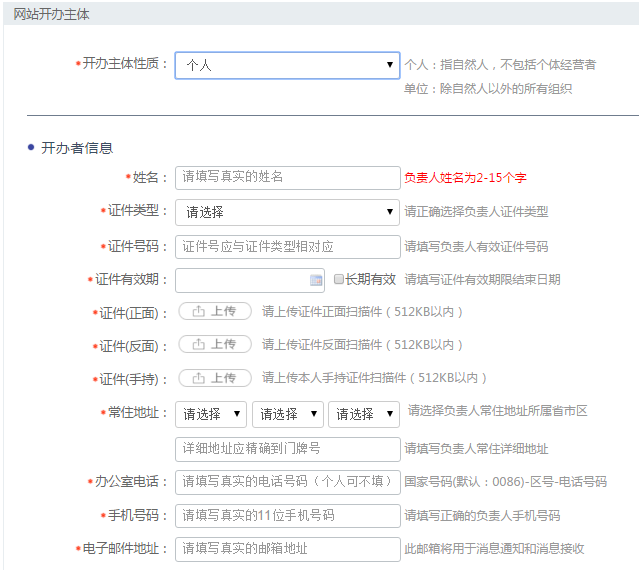 - 填写主体信息,填写完毕后进入”下一步“进入新办网站申请。